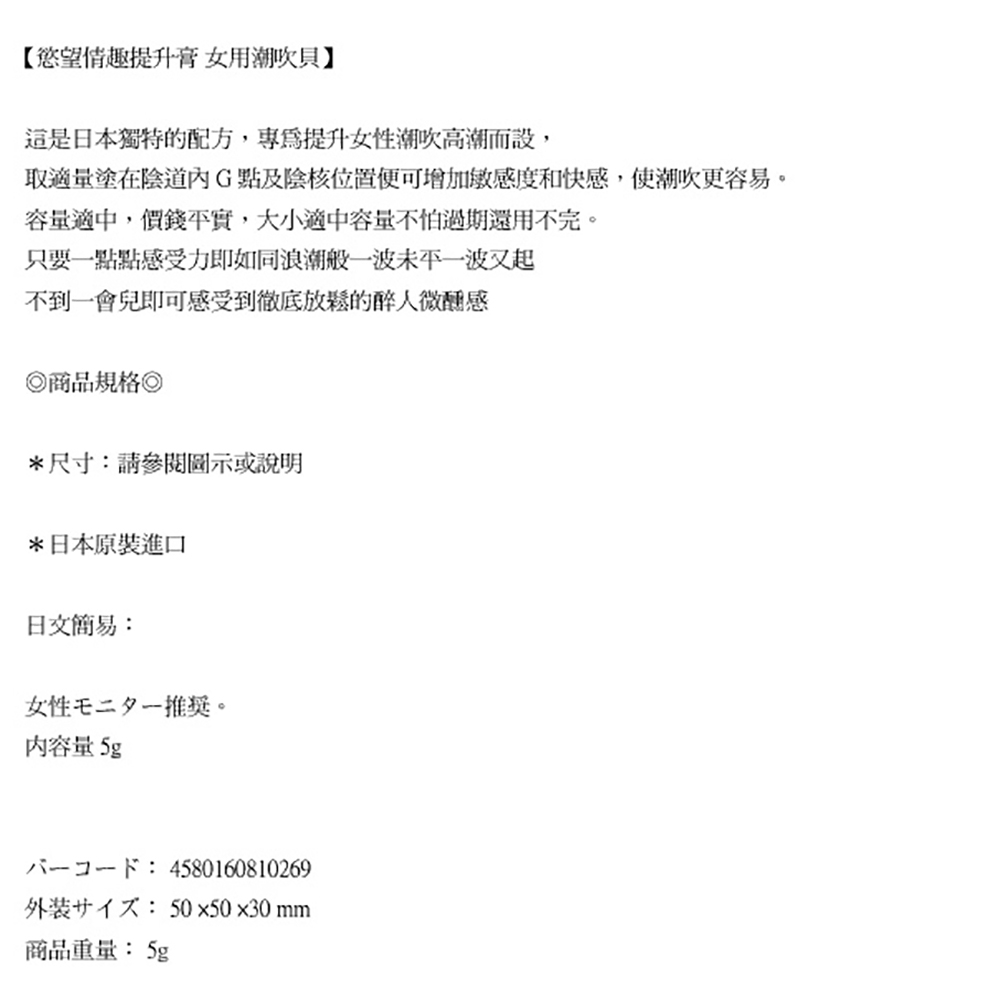 以日本獨有配方特製而成,只要將適量軟膏塗抹在陰蒂及陰道內G點位置,即可有效增強敏感度,更易達致潮吹效果!