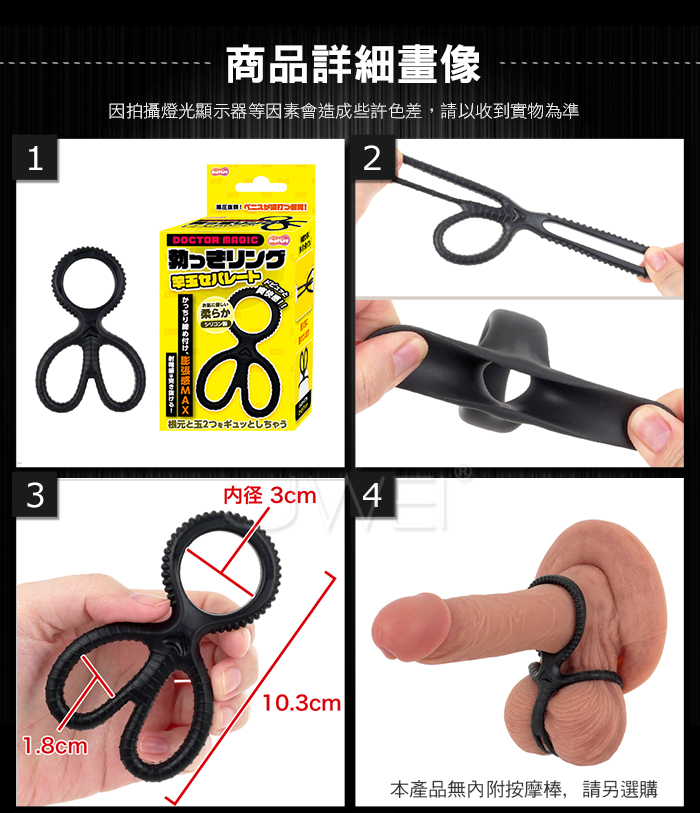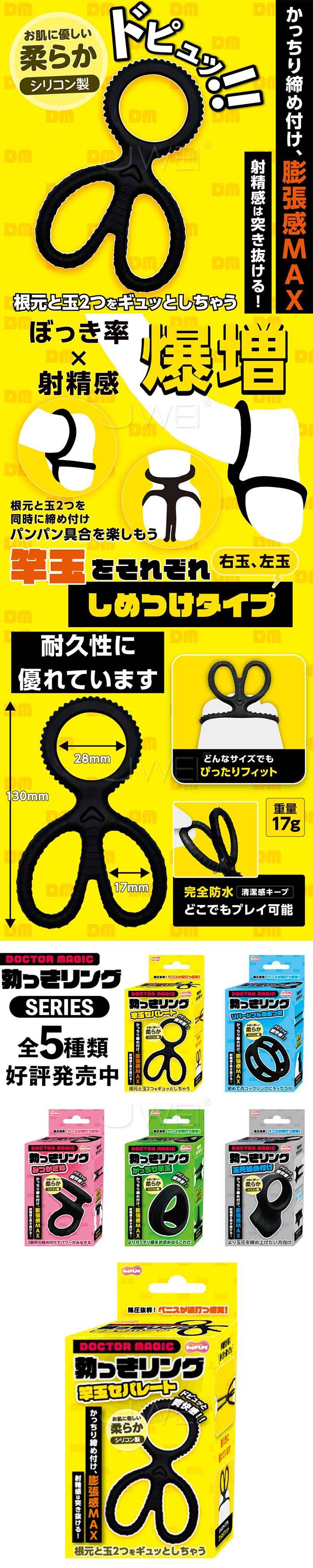 竿と玉を締め付けて、膨張感と持続力をアップするコックリングです。 【竿玉セパレート】は2つの玉を左右でそれぞれ圧迫し、竿と同時に締め付ける3点締めタイプです。 竿を根元から支え、玉を重点的に締め付けることで発射時の快感を向上させます。 3点同時締め付けで普段とは段違いの硬さ、持続力、射出量をサポート。 シリコン製で様々なサイズに対応可能。防水仕様で洗浄も簡単です。 ■箱サイズ:145×73×50mm ■商品サイズ:全長132mm ■商品重量:17g