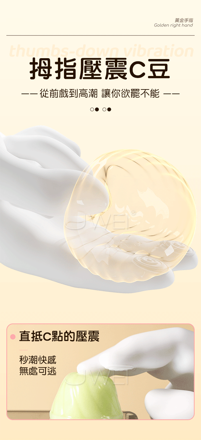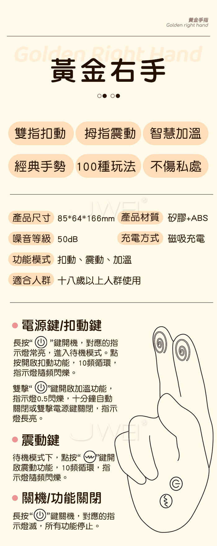 黃金右手指間神技,每一次觸碰都是神奇,精研人體工學,直切G點的黃金曲線 一扣一壓,100種玩法~拇指壓震C點,雙指上翹45度直頂攪動G點,一個都不放過! 智能加溫科技,漸漸升温每一刻都被關愛。 產品規格 ■材質: ABS+矽膠 ■規格: 詳如圖片標示 ■特色: 10頻摳動、10頻震動、加溫