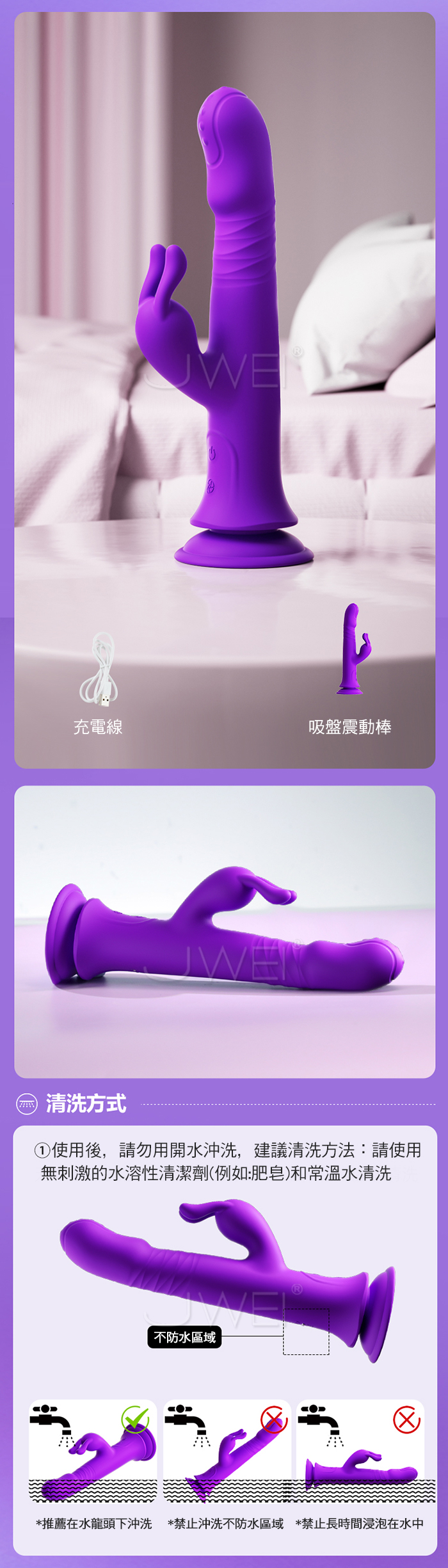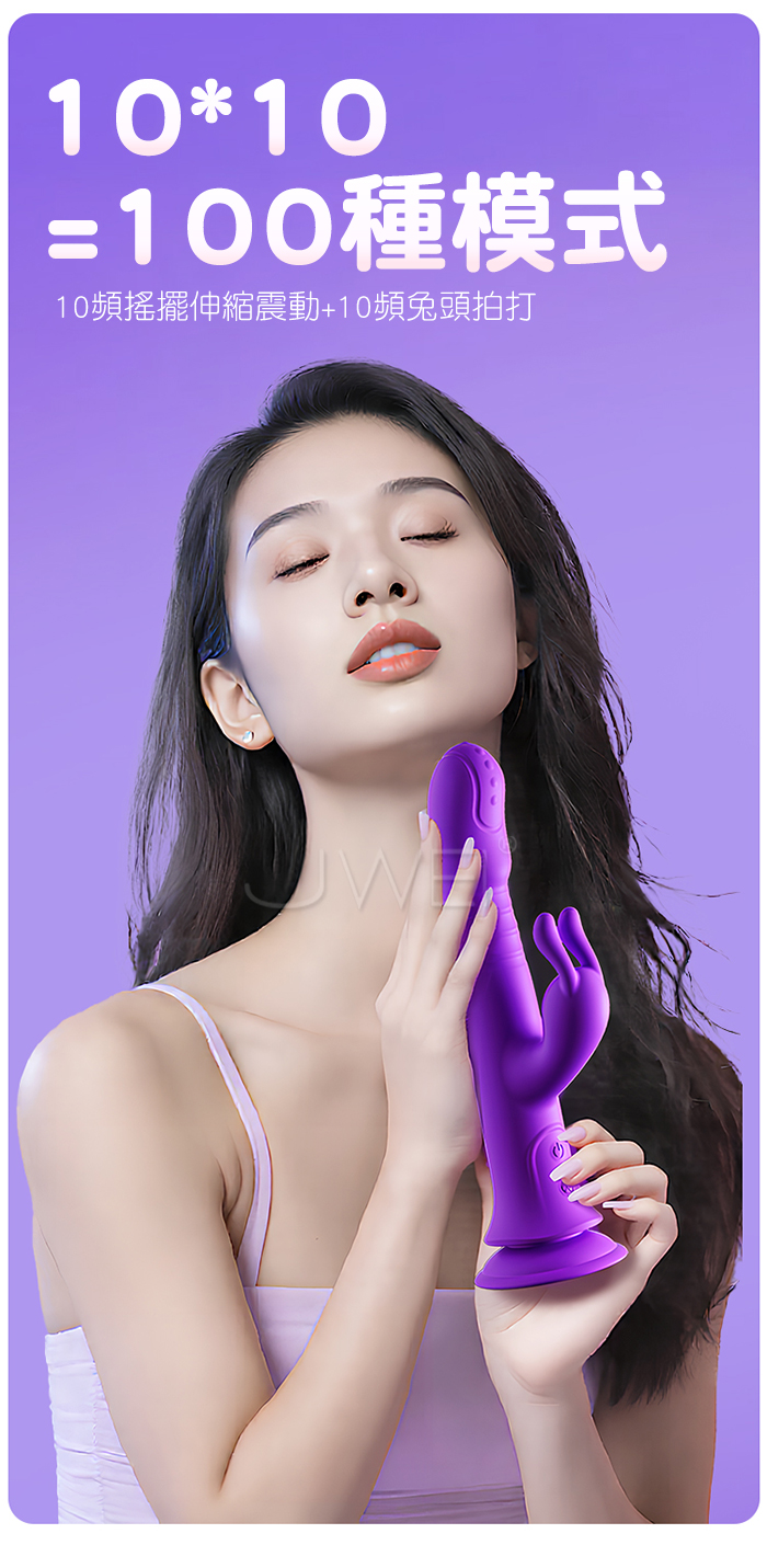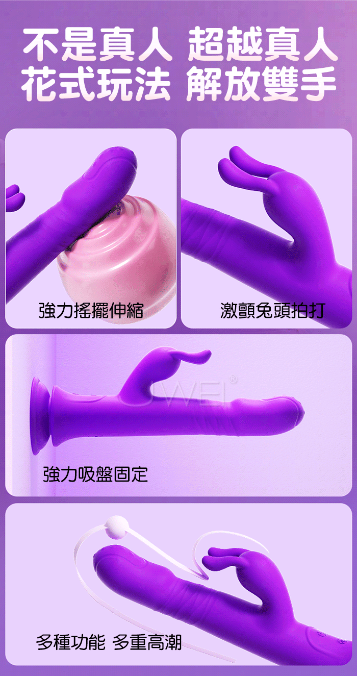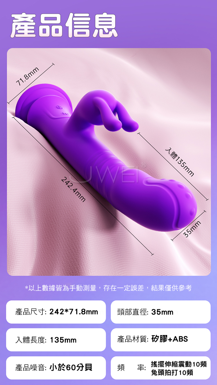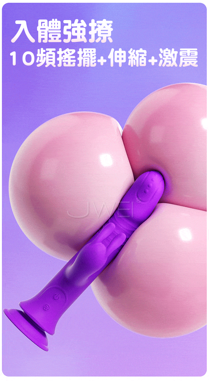 搖擺伸縮 拍打強震,多種玩法 三點共潮,一棒享受三種不同的高潮 不是真人 超越真人,花式玩法 解放雙手,強力搖擺伸縮,激顫兔頭拍打 強力吸盤固定,入體強撩,10頻搖擺+伸縮+激震,強動力不卡機,勇猛強勁看的見~ 產品規格 ■材質: 矽膠+ABS ■規格: 詳如圖片標示 ■功能: 10頻搖擺伸縮震動,10頻兔頭拍打