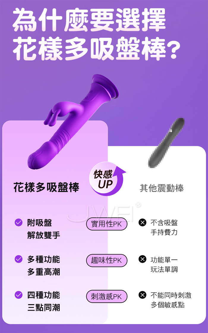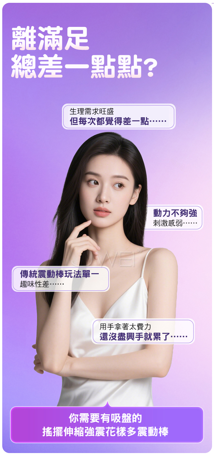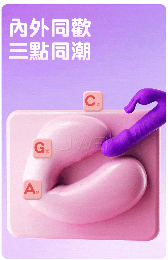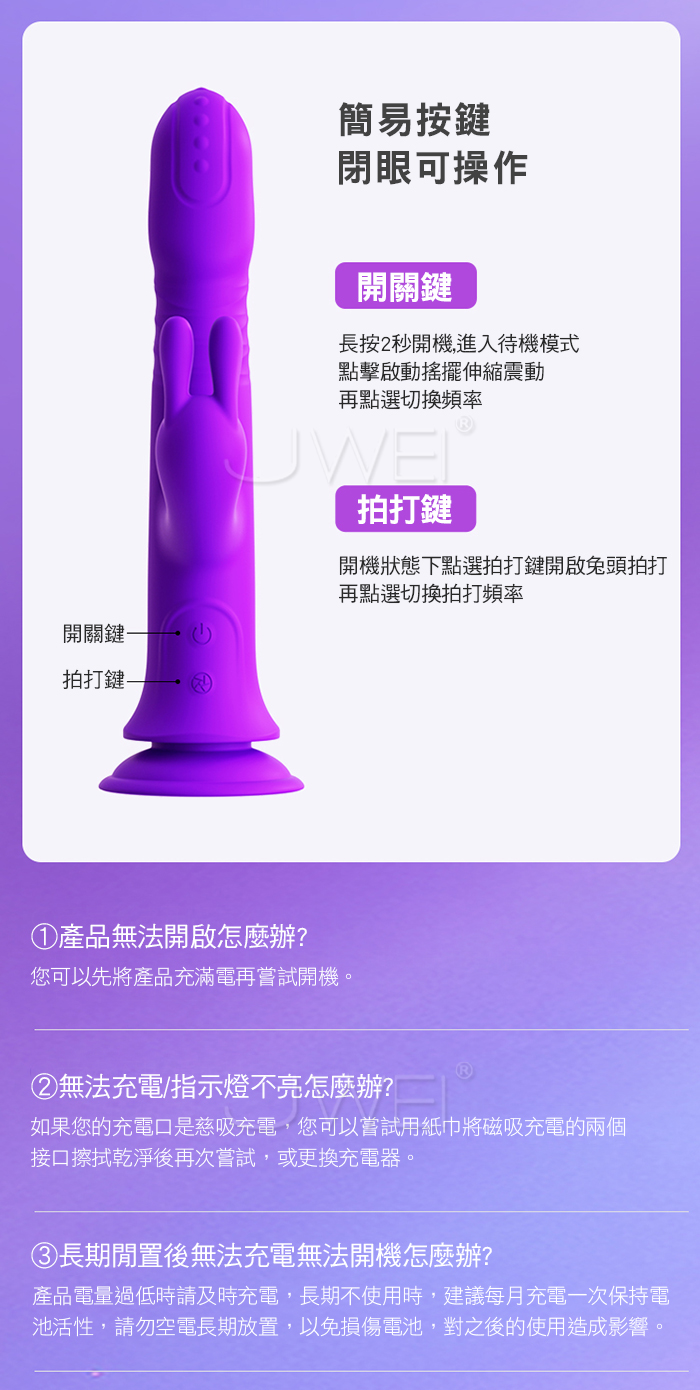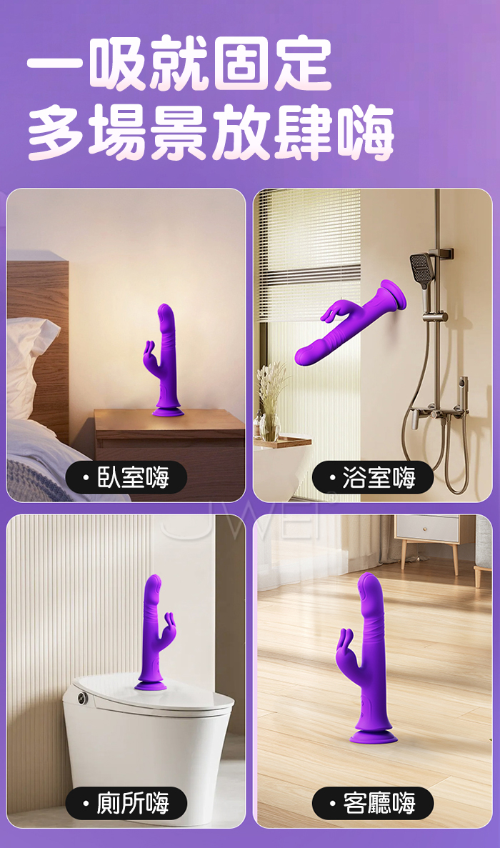 搖擺伸縮 拍打強震,多種玩法 三點共潮,一棒享受三種不同的高潮 不是真人 超越真人,花式玩法 解放雙手,強力搖擺伸縮,激顫兔頭拍打 強力吸盤固定,入體強撩,10頻搖擺+伸縮+激震,強動力不卡機,勇猛強勁看的見~ 產品規格 ■材質: 矽膠+ABS ■規格: 詳如圖片標示 ■功能: 10頻搖擺伸縮震動,10頻兔頭拍打