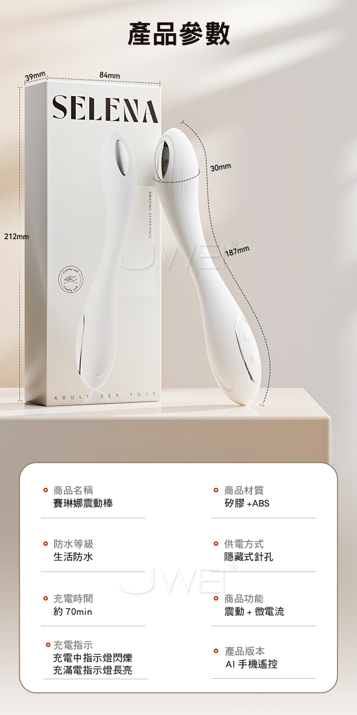 賽琳娜電擊按摩棒,一觸即歡爽顫微電流,多頻穿透式震感,電擊G點嗨點淪 邊電邊震新高潮,體驗電擊功能更爽更刺激!精準撫豆,電擊高潮~ 纖細小蠻腰,飽滿不撐大私處,中部收腰設計,女孩手指的一指多寬,輕鬆入體 穿透式強力震擊,酥麻震顫,連續震動敏感點更容易獲得愉悅感 遠端遙控,智能潮玩跨越山海,小程式控制花樣快樂一手掌握 產品規格 ■材質: 矽膠+ABS ■規格: 詳如圖片標示 ■功能: 10頻震動、10頻電擊、APP智控