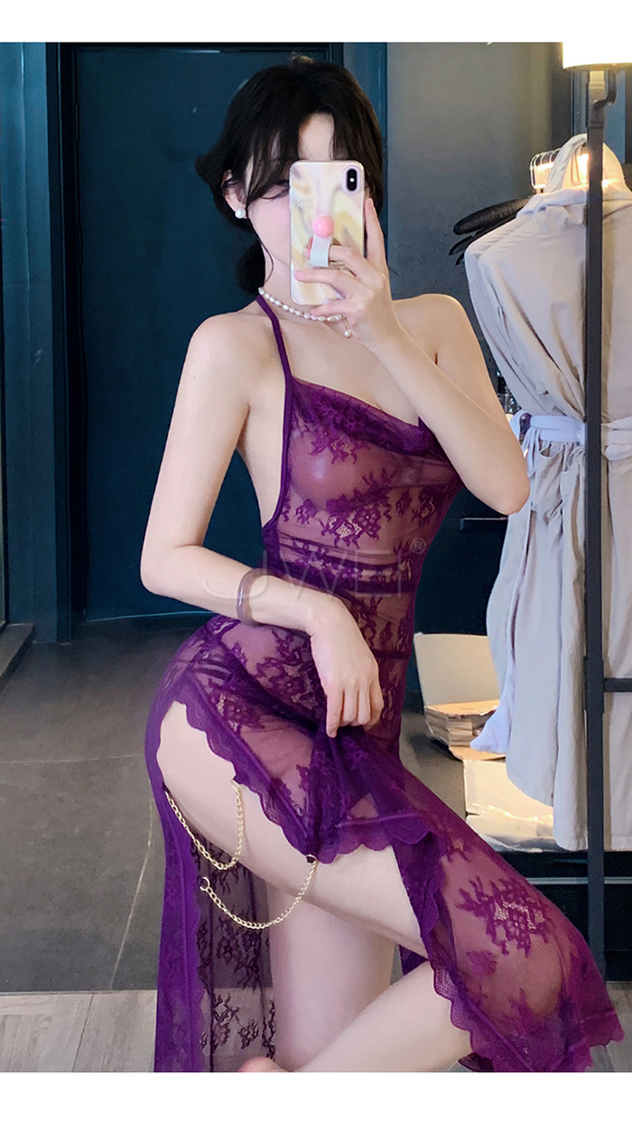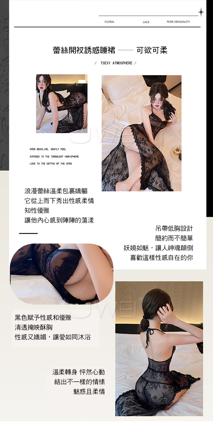 ►您現在的位置:首頁>柔欲佳人.蕾絲蕩領美背半露兩側開衩透視睡裙-黑色【連衣裙+T褲】
