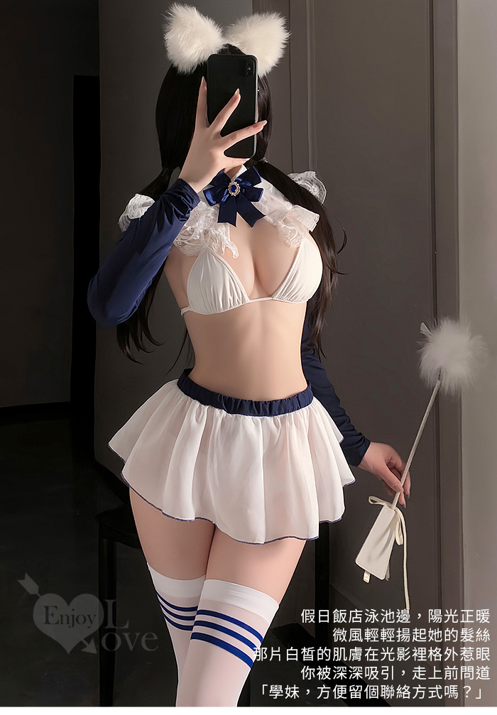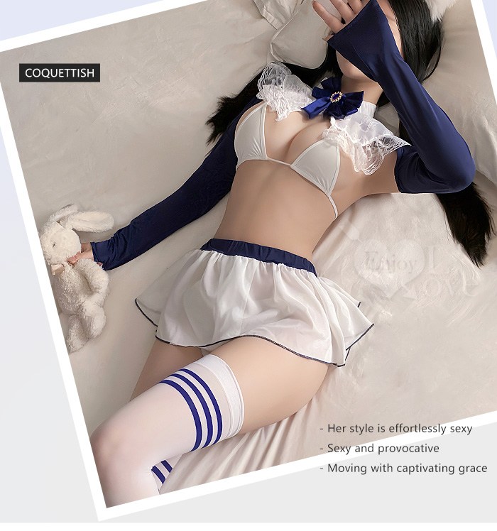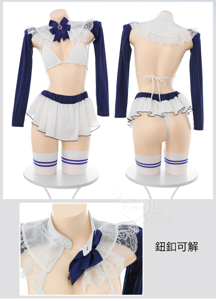 | 「學院藍絲」立領花邊比基尼 × 透紗露臀小短裙 裸背含襪三件組