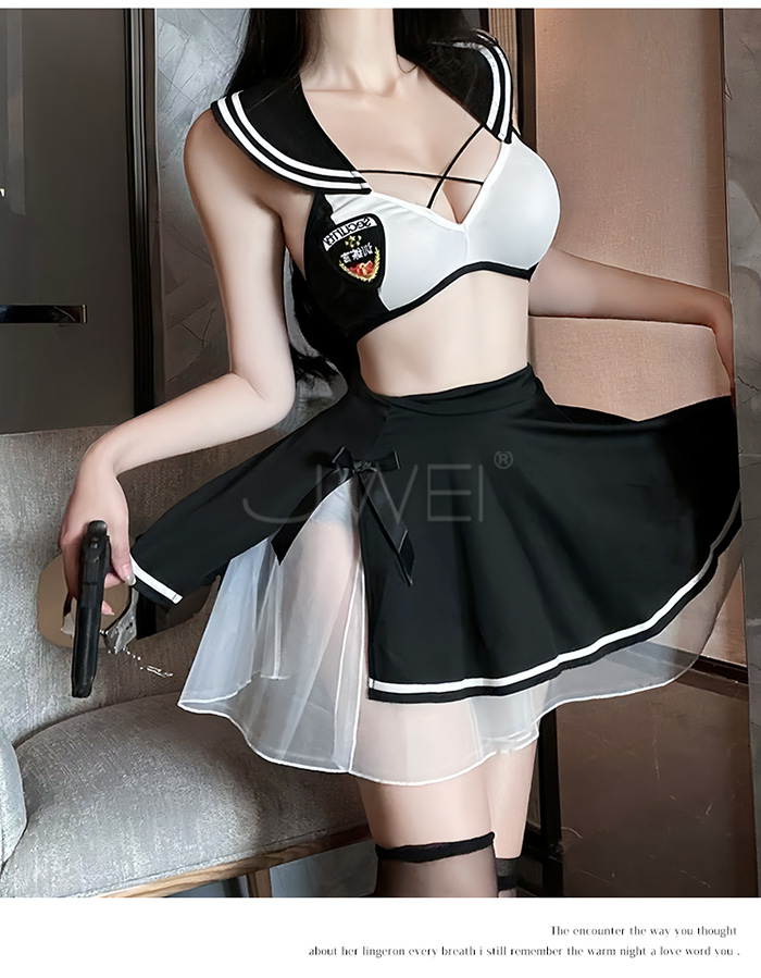 ►您現在的位置:首頁>甜心刑警.胸前交叉繫帶清純百褶透視白紗COS制服套裝【上衣+短裙-黑+白】