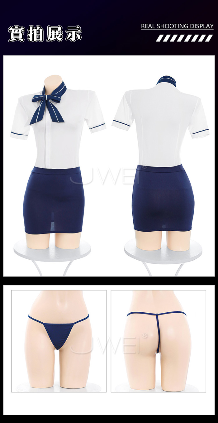 ►您現在的位置:首頁>雲端心機.解扣露溝誘惑修身貼合顯臀禁慾空姐套裝【上衣+裙子+T褲-藍】