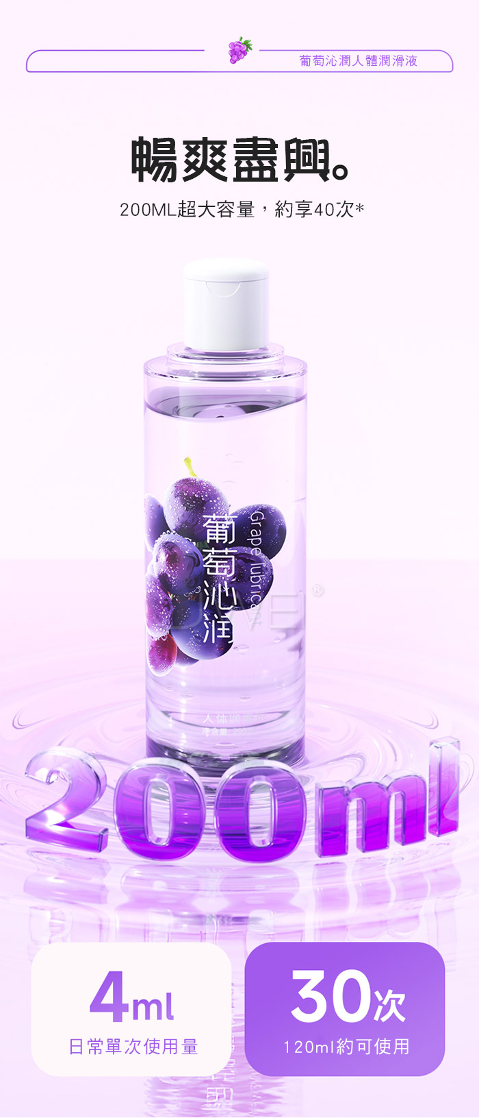 葡萄沁潤,水感潤滑,葡萄沁潤人體潤滑液 讓親密更有儀式感,清新果香潤滑,香甜可口,提升愉悅 拒絕黏膩,如水般輕盈,不黏不油無膠感,事後一擦即可 ●容量:200ml。 ●規格:清新葡萄味 安心可口 清爽不黏。 ●性質:水溶性配方,溫和水潤且輕盈。