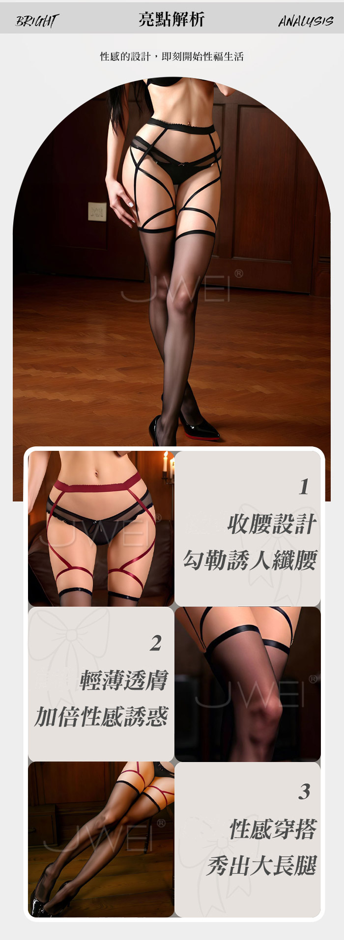 情慾物語.交錯織帶一體式吊帶透膚啞光絲襪【黑色】