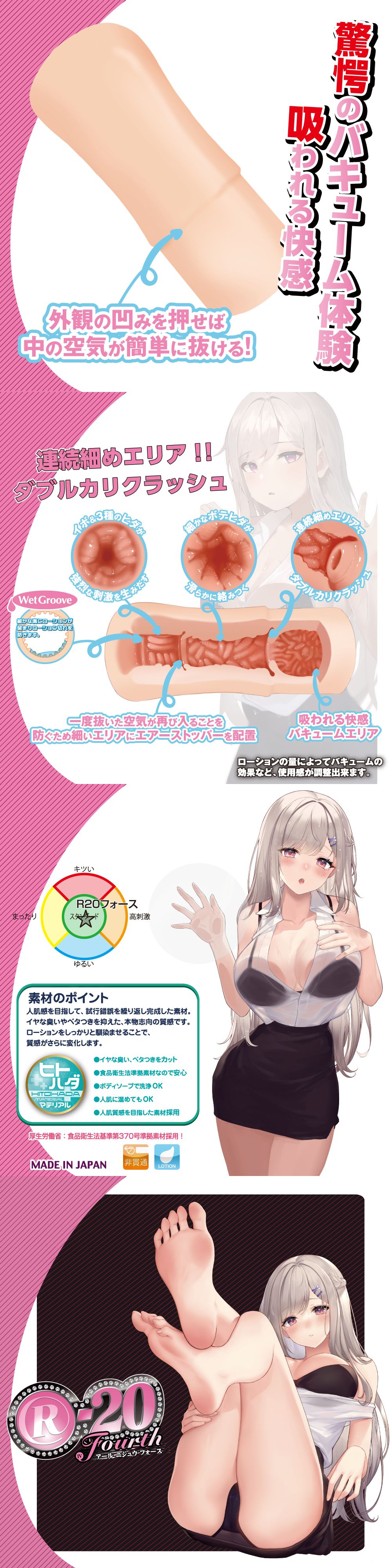 把歷代的內部構造保留再昇華,先是肉粒及3種不同肉紋帶出強烈刺激,再來是幼細的凸起肉紋滑溜地將您的肉棒纏繞,最後超真空吸吮地帶吞噬您的龜頭。