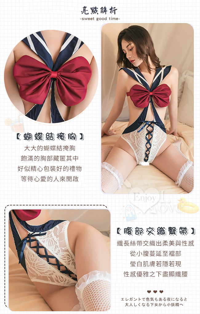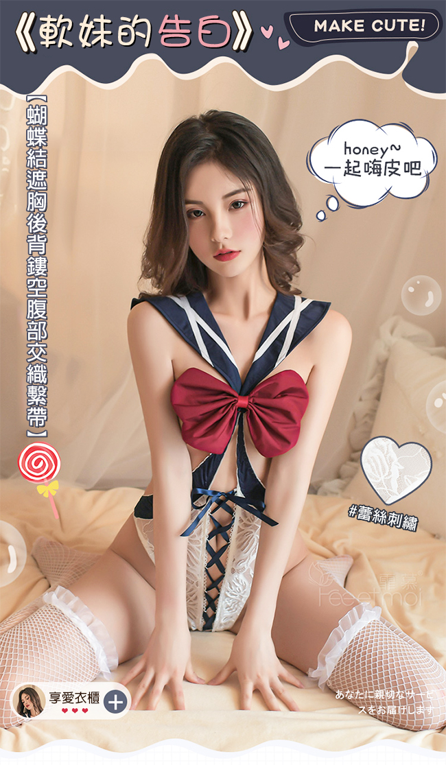 ►您現在的位置:首頁>學生角色扮演服!蝴蝶結遮胸後背鏤空腹部交織繫帶兩件組 - 暗釦可開襠