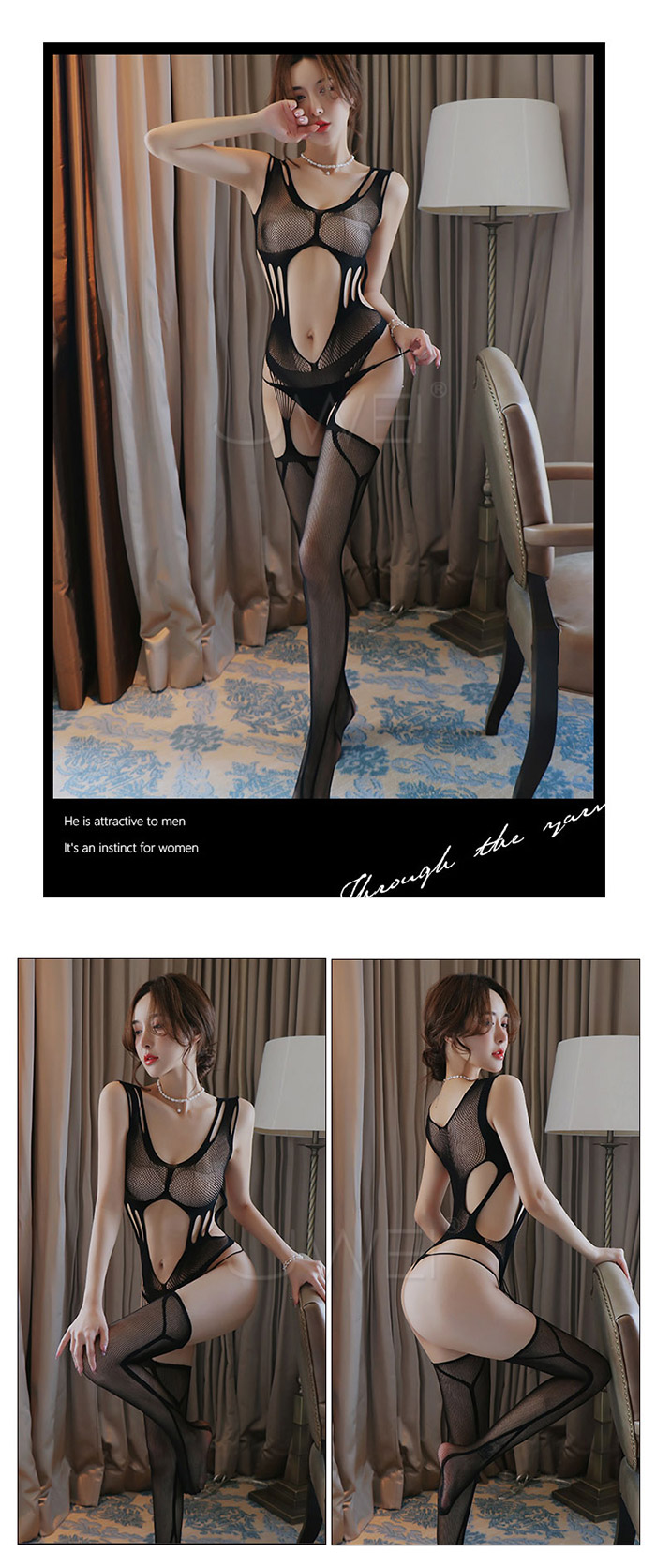 ►您現在的位置:首頁>迷迭誘惑.性感圓孔透視鏤空美背腰部線條吊襪連身貓裝