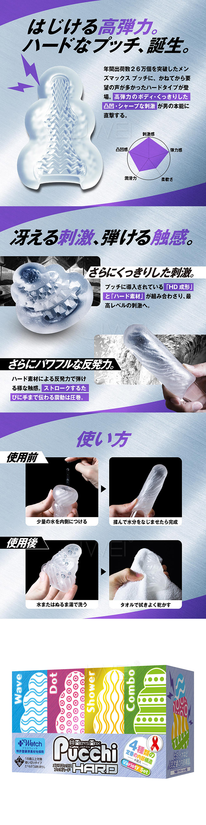 ►您現在的位置:首頁>日本原裝進口MENS MAX . Set Box Variety 自慰套4入組 無需潤滑液 只需要水 即可使用