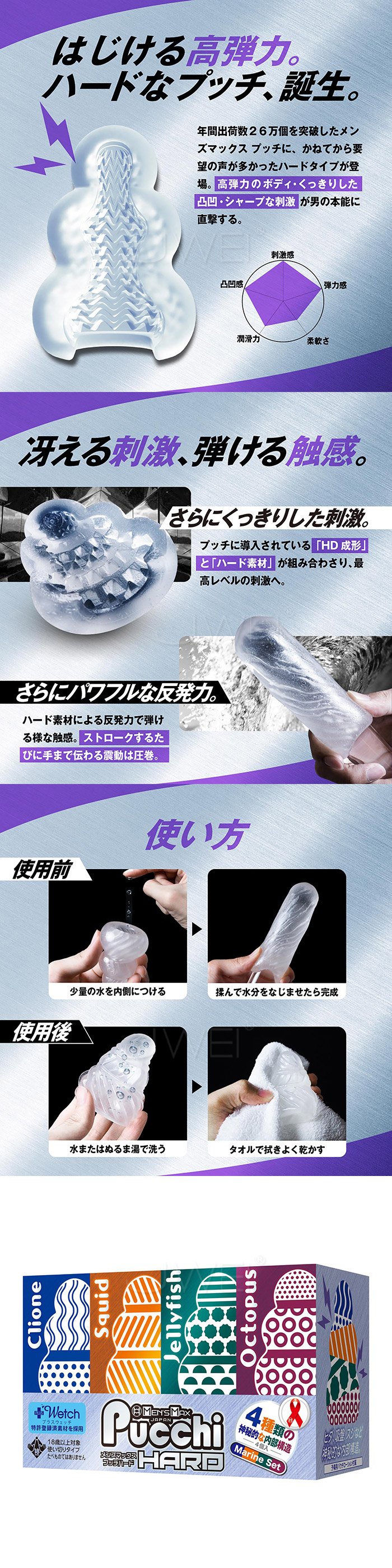►您現在的位置:首頁>日本原裝進口MENS MAX . Set Box Marine 自慰套4入組 無需潤滑液 只需要水 即可使用
