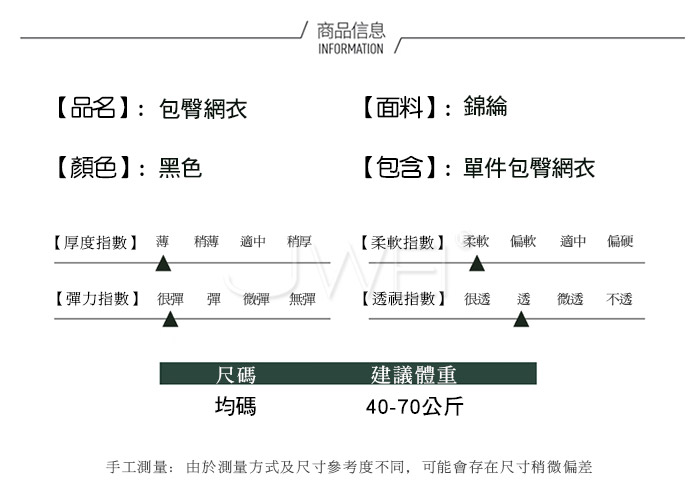 ■內容物:單件網衣 ■適穿尺寸:FREESIZE ■彈性:有 ■未撐開平量尺寸正負誤差1~2cm,1吋=2.54cm ■注意事項:基於保障消費者個人衛生,此貼身衣物恕不接受退換貨。 (如為商品本身暇疵,接受七日內換貨,請勿試穿,謝謝您)