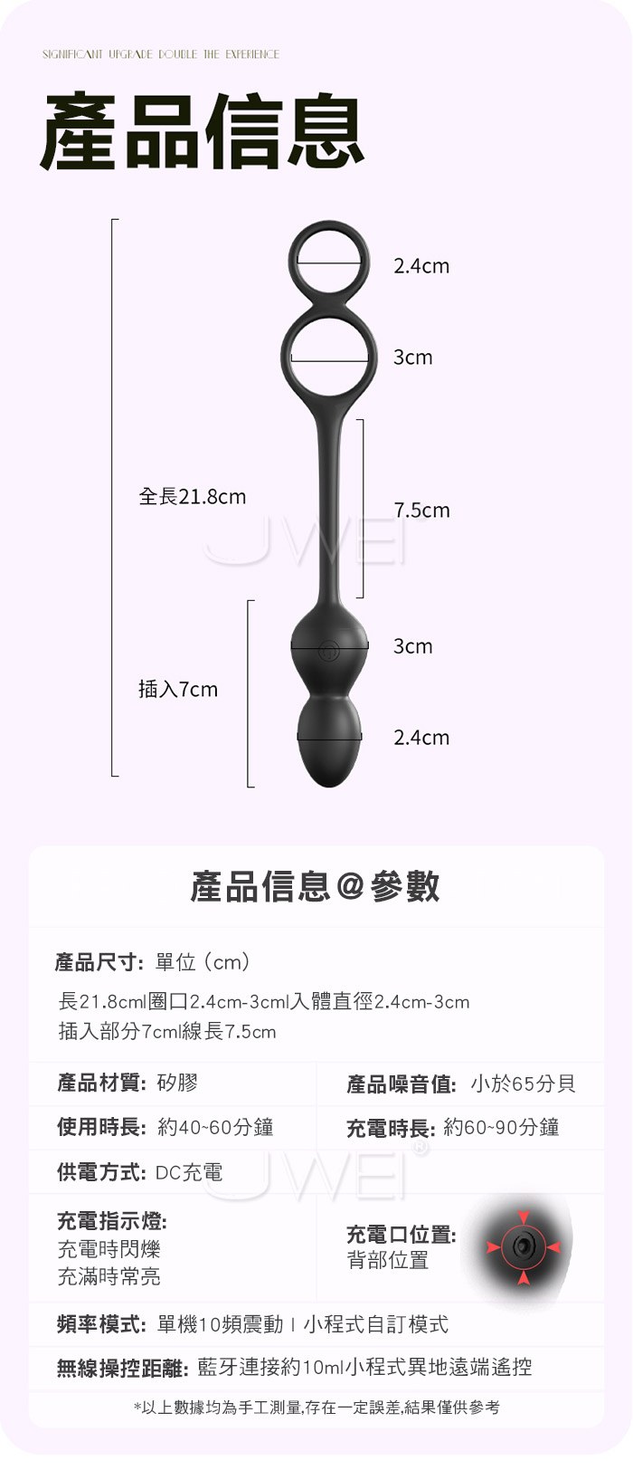 強震觸腺,脈衝直擊G點,引爆深層快感 強勁馬達 十頻強震,快人一步 爽威直達前列腺深處! 兩指不到粗細,葫蘆設計層次推進,入體更健康 產品規格 ■尺寸:大小詳如圖片標示 ■材質:矽膠 ■特點:10頻震動、APP智控