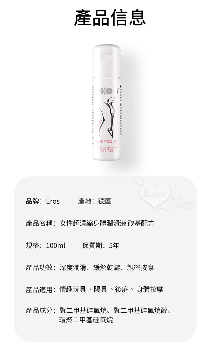 說明: • EROS 女性超濃縮身體潤滑液是一款矽基潤滑劑,專為幹性及敏感性肌膚女性的需求定制。 • 本產品亦可用於按摩,安全性高。 使用方法: 按需取適量 EROS 女性身體潤滑液,塗抹於需補充滋潤的身體部位,使用頻率可根據自身需求調整。 成分:聚二甲基矽氧烷、聚二甲基矽氧烷醇、環聚二甲基矽氧烷等 ‧ 產地:德國原裝進口 ‧ 容量:100ml ‧ 保質期:5年 ‧ 保存期限:請見瓶身底部