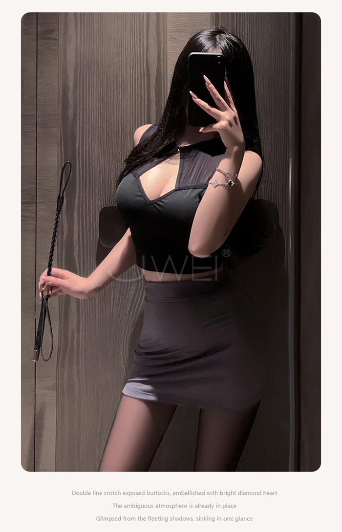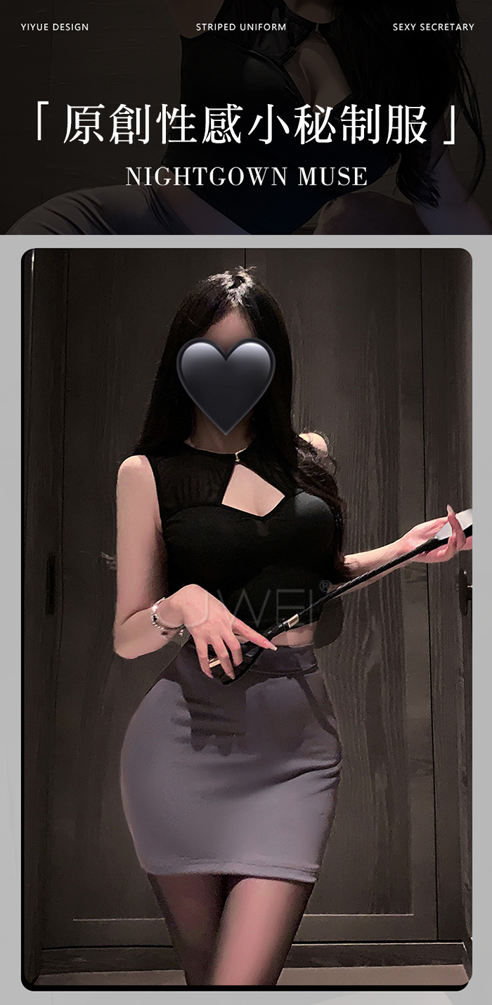 ►您現在的位置:首頁>繆斯秘語.胸前挖空露溝貼身包臀超短裙擺秘書裝【T褲+黑上衣+灰裙】