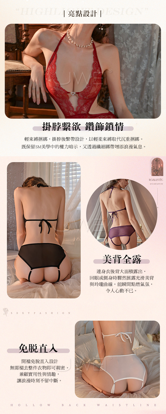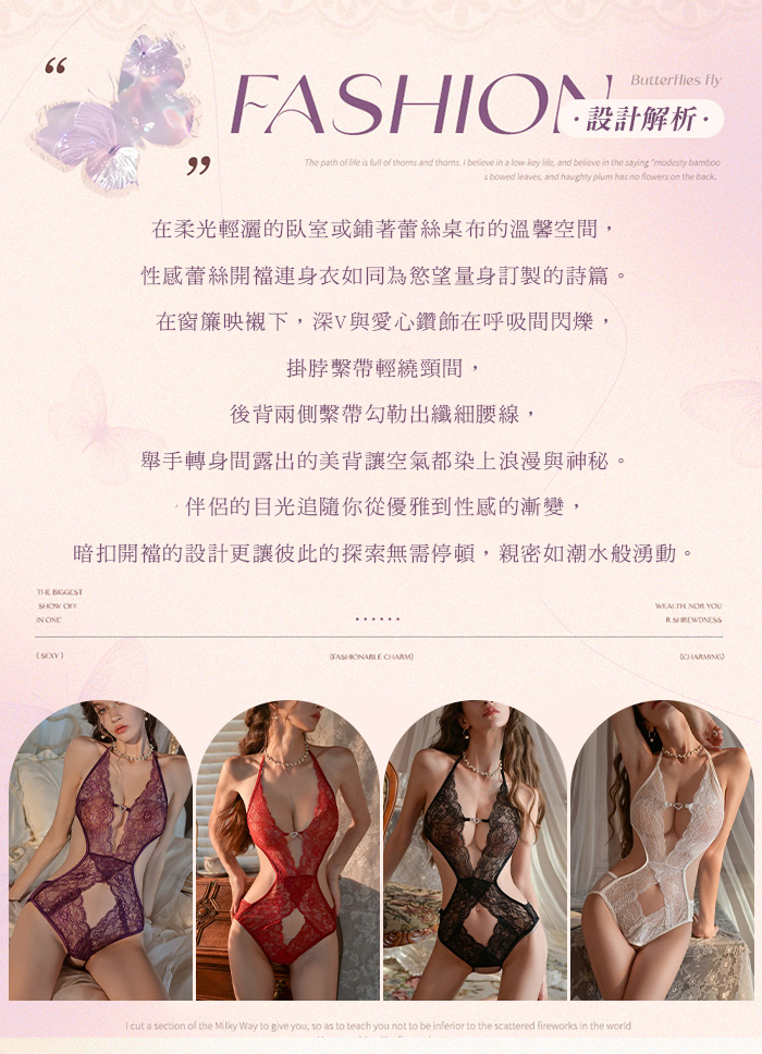 | 繁花似錦.深V愛心鑽飾露胸掛脖繫帶美背蕾絲開襠連體衣【白色】
