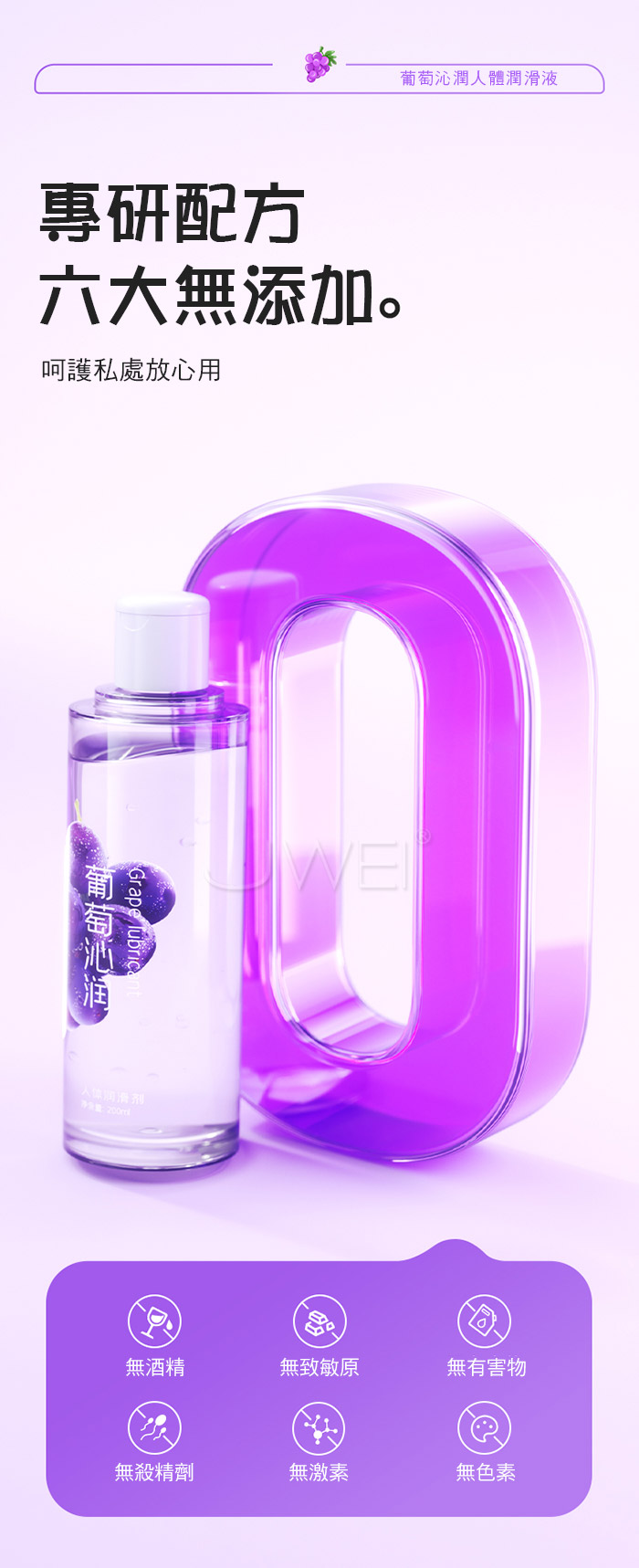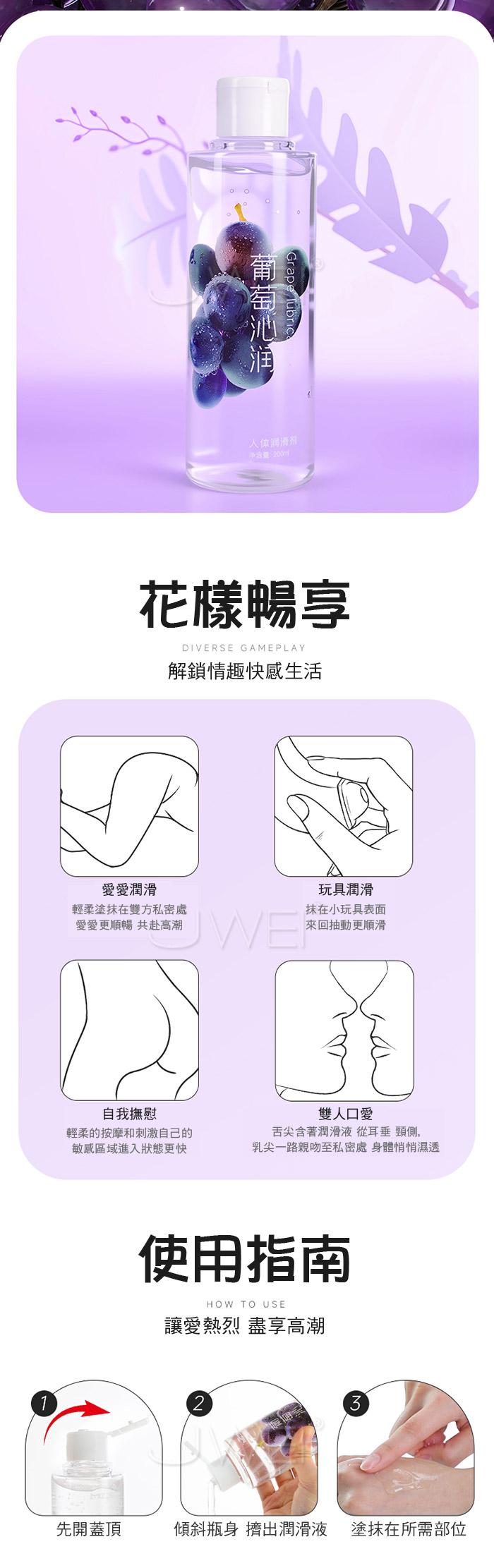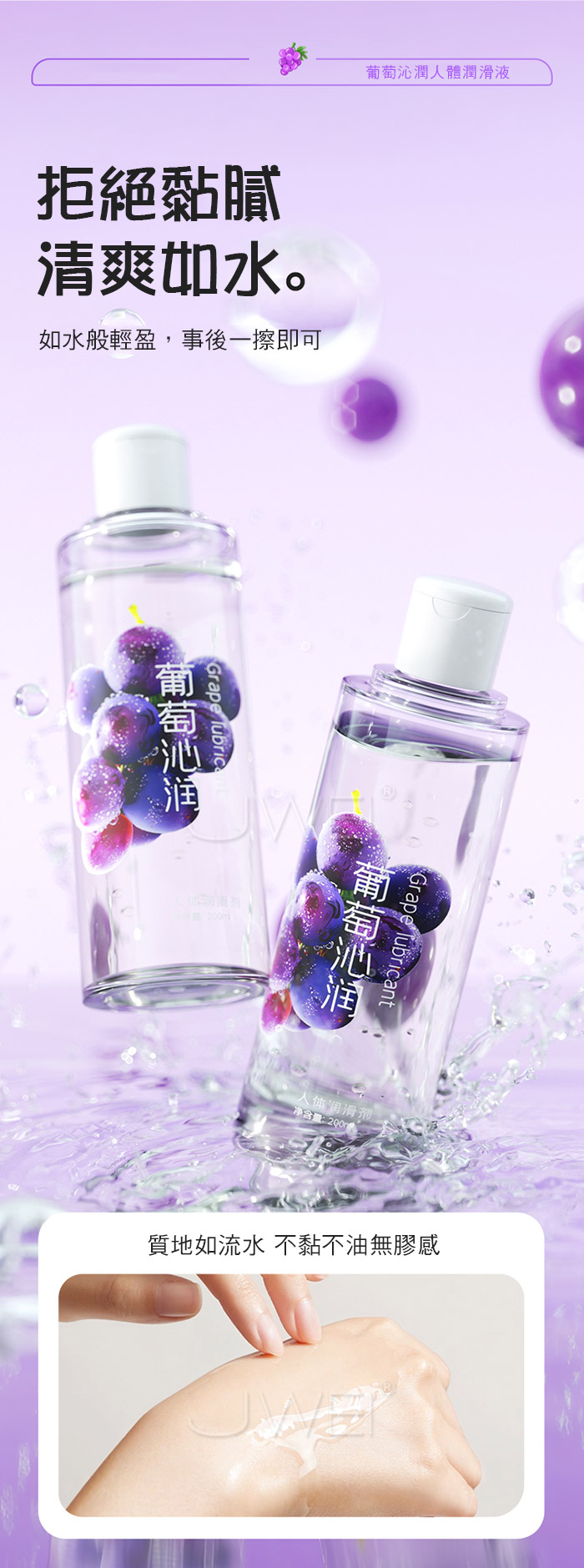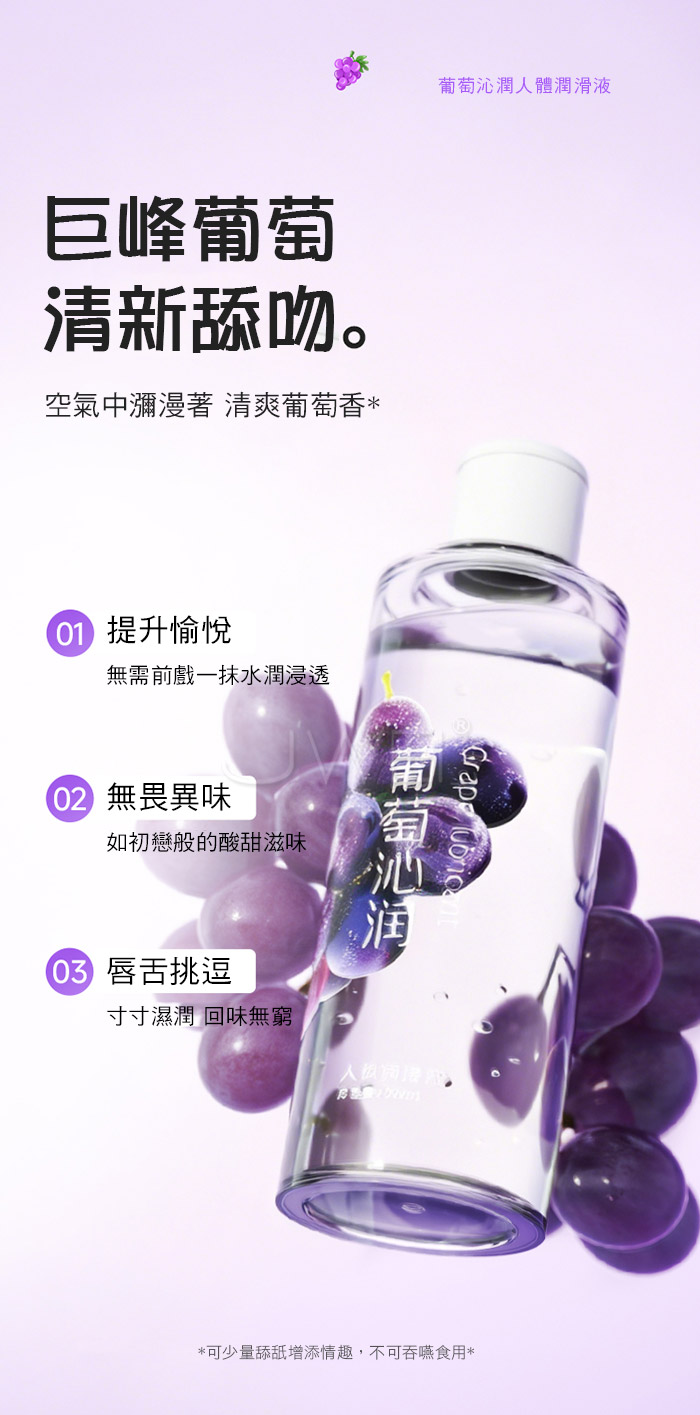 葡萄沁潤,水感潤滑,葡萄沁潤人體潤滑液 讓親密更有儀式感,清新果香潤滑,香甜可口,提升愉悅 拒絕黏膩,如水般輕盈,不黏不油無膠感,事後一擦即可 ●容量:200ml。 ●規格:清新葡萄味 安心可口 清爽不黏。 ●性質:水溶性配方,溫和水潤且輕盈。